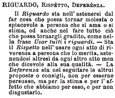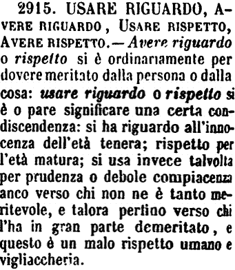 Usare riguardo, Avere riguardo, Usare rispetto, Avere rispetto - Avere riguardo o rispetto si è ordinariamente per dovere meritato dalla persona o dalla cosa: usare riguardo o rispetto si è o pare significare una certa condiscendenza: si ha riguardo all'innocenza dell'età tenera; rispetto per l'età matura; si usa invece talvolta per prudenza o debole compiacenza anco verso chi non ne è tanto meritevole, e talora perfino verso chi l'ha in gran parte demeritato, e questo è un malo rispetto umano e vigliaccheria. [immagine]
