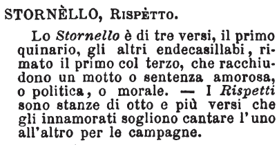 Stornello, Rispetto - Lo Stornello è di tre versi, il primo quinario, gli altri endecasillabi, rimato il primo col terzo, che racchiudono un motto o sentenza amorosa, o politica, o morale. - I Rispetti sono stanze di otto e più versi che gli innamorati sogliono cantare l'uno all'altro per le campagne. [immagine]
