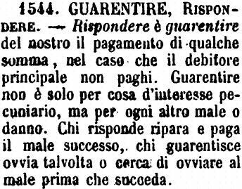 Guarentire, Rispondere - Rispondere è guarentire del nostro il pagamento di qualche somma, nel caso che il debitore principale non paghi. Guarentire non è solo per cosa d'interesse pecuniario, ma per ogni altro male o danno. Chi risponde ripara e paga il male successo, chi guarentisce ovvia talvolta o cerca di ovviare al male prima che succeda. [immagine]