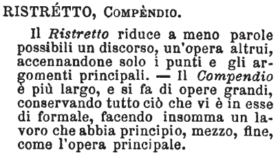 | Ristretto, Compendio - Il Ristretto riduce a meno parole possibili un discorso, un'opera altrui, accennandone solo i punti e gli argomenti principali. - Il Compendio è più largo, e si fa di opere grandi, conservando tutto ciò che vi è in esse di formale, facendo insomma un lavoro che abbia principio, mezzo, fine, come l'opera principale. [immagine] |