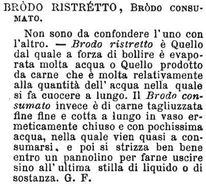 | Brodo ristretto, Brodo consumato - Non sono da confondere l'uno con l'altro. - Brodo ristretto è Quello dal quale a forza di bollire è evaporata molta acqua o Quello prodotto da carne che è molta relativamente alla quantità dell'acqua nella quale si fa cuocere a lungo. Il Brodo consumato invece è di carne tagliuzzata fine fine e cotta a lungo in vaso ermeticamente chiuso e con pochissima acqua, nella quale vien quasi a consumarsi, e poi si strizza ben bene entro un pannolino per farne uscire sino all'ultima stilla di liquido o di sostanza. G. F. [immagine] |