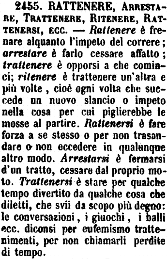 | Rattenere, Arrestare, Trattenere, Ritenere, Rattenersi, Ecc. - Rattenere è frenare alquanto l'impeto del correre; arrestare è farlo cessare affatto; trattenere è opporsi a che cominci; ritenere è trattenere un'altra e più volte, cioè ogni volta che succede un nuovo slancio o impeto nella cosa per cui piglierebbe le mosse al partire. Rattenersi è fare forza a se stesso o per non trasandare o non eccedere in qualunque altro modo. Arrestarsi è fermarsi d'un tratto, cessare dal proprio moto. Trattenersi è stare per qualche tempo divertito da qualche cosa che diletti, che svii da scopo più degno: le conversazioni, i giuochi, i balli ecc. diconsi per eufemismo trattenimenti, per non chiamarli perdite di tempo. [immagine] |
