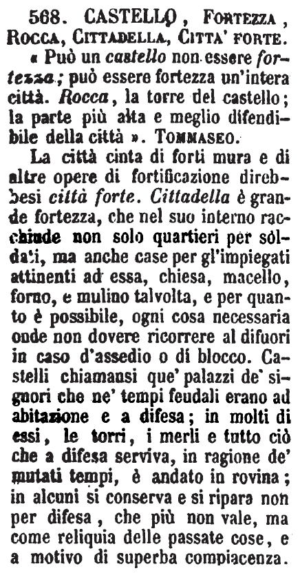 | Castello, Fortezza, Rocca, Cittadella, Città forte - «Può un castello non essere fortezza; può essere fortezza un'intera città. Rocca, la torre del castello; la parte più alta e meglio difendibile della città.» Tommaseo.