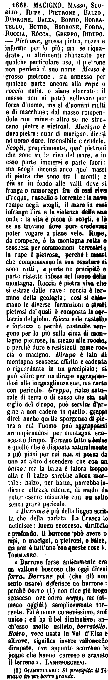 | Macigno, Masso, Scoglio, Rupe, Pietrone, Balzo, Burrone, Balza, Borro, Borratello, Botro, Borrone, Forra, Roccia, Rocca, Greppo, Dirupo - Pietrone, grossa pietra, rozza e informe per lo più; ma se riquadrato, o altrimenti abbozzato per qualche particolare uso, il pietrone non perderà il suo nome. Masso è grosso pietrone, sia annesso per qualche parte ancora alla rupe o roccia natia o siane staccato: il masso non si potrà sollevare per forza d'uomo, ma sì d'uomini molti e di macchine; dal masso rompendolo con mine o altro se ne staccano pietre e pietroni. Macigno è dura pietra: cuor di macigno, dicesi ad un uomo duro, insensibile e crudele. Scogli, propriamente, que' pietroni che sono su la riva del mare, e in esso parte immersi e parte fuori: ma scogli diconsi anco que' massi di pietra che sono tra i monti; e più se in fondo alle valli dove si franga o rumoreggi fra di essi rivo d'acqua, ruscello o torrente: la nave rompe negli scogli, il mare in essi infrange l'ira e la violenza delle sue onde: la vita è piena di scogli, e là se ne trovano dove pure credevasi poter vogare a piene vele. Rupe, da rompere, è la montagna rotta e scoscesa per commozioni terrestri; la rupe è pietrosa, perchè i massi che componevano la sua ossatura si sono rotti, e parte ne precipitò e parte ristette infissa nel fianco della montagna. Roccia è pietra viva che si estrae dalle cave: roccia è termine della geologia; così si chiamano le diverse formazioni o strati pietrosi de' quali è composta la corteccia del globo. Rocca vale castello e fortezza o perchè, costruite vengono per lo più sulla cima di montagne pietrose, in mezzo alle roccie, o perchè dure e resistenti come roccia o macigno. Dirupo è lato di montagna scoscesa affatto e cadente o riguardante in un precipizio; si può salire per un dirupo aggrappandosi alle ineguaglianze sue, ma certo con pericolo. Greppo, rialzo naturale di terra o di sasso che sta sul ciglio del dirupo, può servire, può servire d'argine a non cadere in quello: greppi direi anche quelle sporgenze di pietra a cui l'uomo può aggrapparsi arrampicandosi per montagna scoscesa o dirupo. Terreno fatto a balze è quello che è disposto naturalmente a più piani per cui non si possa da uno ad altro discendere che con un balzo: ma la balza è talora troppo alta e il balzo sarebbe allora mortale: balzo, per balza, parrebbe indicare altezza minore, di modo da poter essere misurato con un salto senza grave pericolo.