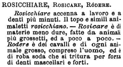 | Rosicchiare, Rosicare, Rodere - Rosicchiare accenna a lavoro e a denti più minuti. Il topo e simili animaletti rosicchiano. — Rosicare è di materie meno dure, fatte da animali più grossetti, ed a poco a poco. — Rodere è dei cavalli e di ogni animale grosso, compreso l'uomo, ed è di roba soda che si tritura per forza di denti mascellari e forti. [immagine] |