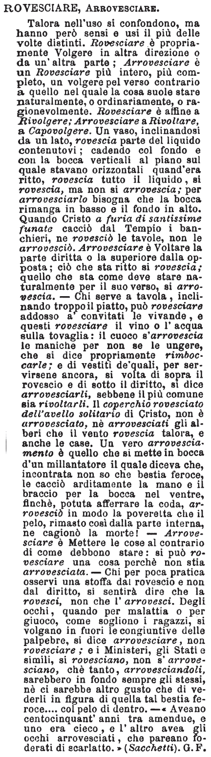 | Rovesciare, Arrovesciare - Talora nell'uso si confondono, ma hanno però sensi e usi il più delle volte distinti. Rovesciare è propriamente Volgere in altra direzione o da un'altra parte; Arrovesciare è un Rovesciare più intero, più completo, un volgere pel verso contrario a quello nel quale la cosa suole stare naturalmente, o ordinariamente, o ragionevolmente. Rovesciare è affine a Rivolgere; Arrovesciare a Rivoltare, a Capovolgere. Un vaso, inclinandosi da un lato, rovescia parte del liquido contenutovi; cadendo col fondo e con la bocca verticali al piano sul quale stavano orizzontali quand'era ritto, rovescia tutto il liquido, si rovescia, ma non si arrovescia; per arrovesciarlo bisogna che la bocca rimanga in basso e il fondo in alto. Quando Cristo a furia di santissime funate cacciò dal Tempio i banchieri, ne rovesciò le tavole, non le arrovesciò. Arrovesciare è Voltare la parte diritta o la superiore dalla opposta; ciò che sta ritto si rovescia; quello che sta come deve stare naturalmente per il suo verso, si arrovescia. - Chi serve a tavola, inclinando troppo il piatto, può rovesciare addosso a' convitati le vivande, e questi rovesciare il vino o l'acqua sulla tovaglia: il cuoco s'arrovescia le maniche per non se le ungere, che si dice propriamente rimboccarle; e di vestiti de' quali, per servirsene ancora, si volta di sopra il rovescio e di sotto il diritto, si dice arrovesciarli, sebbene il più comune sia rivoltarli. Il coperchio rovesciato dell'avello solitario di Cristo, non è arrovesciato, nè arrovesciati gli alberi che il vento rovescia talora, e anche le case. Un vero arrovesciamento è quello che si mette in bocca d'un millantatore il quale diceva che, incontrata non so che bestia feroce, le cacciò arditamente la mano e il braccio per la bocca nel ventre, finchè, potuta afferrare la coda, arrovesciò in modo la poveretta che il pelo, rimasto così dalla parte interna, ne cagionò la morte! - Arrovesciare è Mettere le cose al contrario di come debbono stare: si può rovesciare una cosa perchè non stia arrovesciata. - Chi per poca pratica osservi una stoffa dal rovescio e non dal diritto, si sentirà dire che la rovesci, non che l'arrovesci. Degli occhi, quando per malattia o per giuoco, come sogliono i ragazzi, si volgano in fuori le congiuntive delle palpebre, si dice arrovesciare, non rovesciare; e i Ministeri, gli Stati e simili, si rovesciano, non s'arrovesciano, chè tanto, arrovesciandoli, sarebbero in fondo sempre gli stessi, nè ci sarebbe altro gusto che di vederli in figura di quella tal bestia feroce.... col pelo di dentro. - « Aveano centocinquant'anni tra amendue, e uno era cieco, e l'altro avea gli occhi arrovesciati, che pareano foderati di scarlatto. » (Sacchetti). G. F. [immagine] |