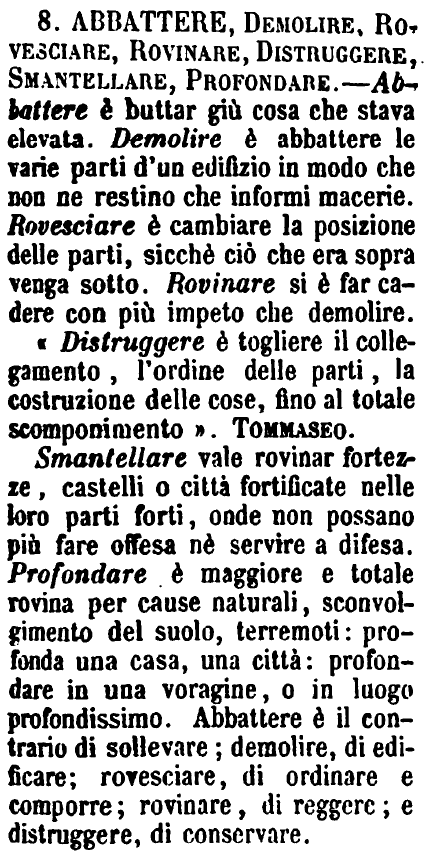 « Distruggere è togliere il collegamento, l'ordine delle parti, la costruzione delle cose, fino al totale scomponimento ». Tommaseo. Smantellare vale rovinar fortezze, castelli o città fortificate nelle loro parti forti, onde non possano più fare offesa nè servire a difesa. Profondare è maggiore e totale rovina per cause naturali, sconvolgimento del suolo, terremoti: profonda una casa, una città: profondare in una voragine, o in luogo profondissimo. Abbattere è il contrario di sollevare; demolire, di edificare; rovesciare, di ordinare e comporre; rovinare, di reggere; e distruggere, di conservare. [immagine] |