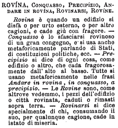 | Rovina, Conquasso, Precipizio, Andare in rovina, Rovinarsi, Rovine - Rovina è quando un edifizio si disfà o per urto esterno, o per altre cagioni, e cade giù con fragore. - Conquasso è lo sfasciarsi rovinoso di un gran congegno, e si usa anche metaforicamente parlando di Stati, di costituzioni politiche, ecc. - Precipizio si dice di ogni cosa, come edifizio o altro, che cada fragorosamente dall'alto al basso. Tutte si usano metaforicamente nelle frasi Andare in rovina, in conquasso, a precipizio. - Le Rovine sono, come altrove vedemmo, i pezzi dell'edifizio o città rovinata, caduti o rimasti sopra terra. - Rovinarsi si dice specialmente di chi, consumando il suo, per qualunque cagione, cade in istato di miseria. [immagine] |