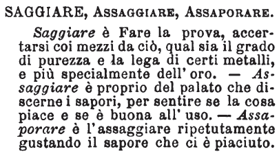 | Saggiare, Assaggiare, Assaporare - Saggiare è Fare la prova, accertarsi coi mezzi da ciò, qual sia il grado di purezza e la lega di certi metalli, e più specialmente dell'oro. - Assaggiare è proprio del palato che discerne i sapori, per sentire se la cosa piace e se è buona all'uso. - Assaporare è l'assaggiare ripetutamente gustando il sapore che ci è piaciuto. [immagine] |