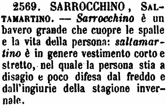 Sarrocchino, Saltamartino - Sarrocchino è un bavero grande che cuopre le spalle e la vita della persona: saltamartino è in genere vestimento corto e stretto, nel quale la persona stia a disagio e poco difesa dal freddo e dall'ingiurie della stagione invernale. [immagine]