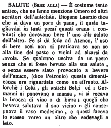 | Bere alla salute - Questa usanza è molto antica. I Greci ed i Romani l'osservavano esattamente; la seguirono i Celti, ed i Germani pure l'adottarono. [immagine] |