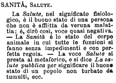 | Sanità, Salute - La Salute, nel significato fisiologico, è il buono stato di una persona che non è afflitta da veruna malattia; è, dirò così, voce quasi negativa. - La Sanità è lo stato del corpo animale in cui tutte le funzioni si fanno senza impedimenti e con perfetta regola. - La voce Salute si presta al metaforico, e si dice La salute pubblica per significare il buono stato di un popolo non turbato da tumulti, ecc. [immagine] |