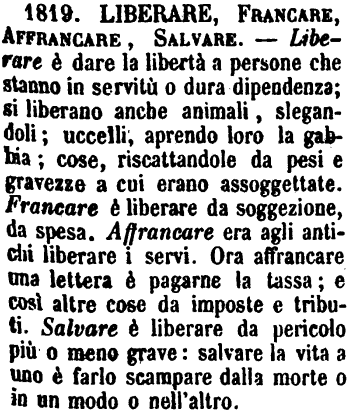 Liberare, Francare, Affrancare, Salvare - Liberare è dare la libertà a persone che stanno in servitù o dura dipendenza; si liberano anche animali, slegandoli; uccelli, aprendo loro la gabbia; cose, riscattandole da pesi e gravezze a cui erano assoggettate. Francare è liberare da soggezione, da spesa. Affrancare era agli antichi liberare i servi. Ora affrancare una lettera è pagarne la tassa; e così altre cose da imposte e tributi. Salvare è liberare da pericolo più o meno grave: salvare la vita a uno è farlo scampare dalla morte o in un modo o nell'altro. [immagine]