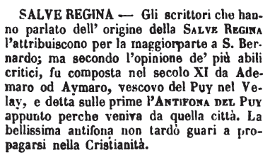 | Salve regina - Gli scrittori che hanno parlato dell'origine della Salve Regina l'attribuiscono per la maggior parte a S. Bernardo; ma secondo l'opinione de'più abili critici, fu composta nel secolo XI da Ademaro od Aymaro, vescovo del Puy nel Velay, e detta sulle prime l'Antifona del Puy appunto perchè veniva da quella città. La bellissima antifona non tardò guari a propagarsi nella Cristianità. [immagine] |