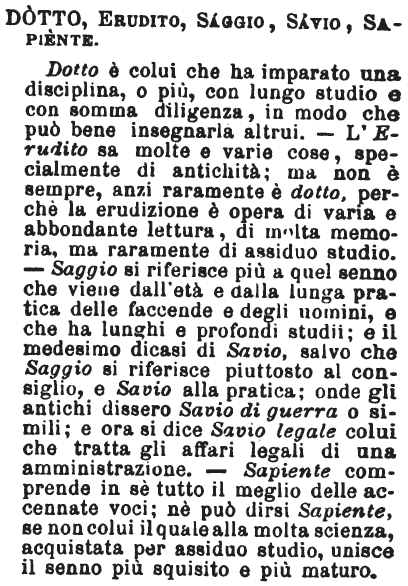 Dotto, Erudito, Saggio, Savio, Sapiente - Dotto è colui che ha imparato una disciplina, o più, con lungo studio e con somma diligenza, in modo che può bene insegnarla altrui. - L'Erudito sa molte e varie cose, specialmente di antichità; ma non è sempre, anzi raramente è dotto, perché la erudizione è opera di varia e abbondante lettura, di molta memoria, ma raramente di assiduo studio. - Saggio si riferisce più a quel senno che viene dall'età e dalla lunga pratica delle faccende e degli uomini, e che ha lunghi e profondi studii; e il medesimo dicasi di Savio, salvo che Saggio si riferisce piuttosto al consiglio, e Savio alla pratica; onde gli antichi dissero Savio di guerra o simili; e ora si dice Savio legale colui che tratta gli affari legali di una amministrazione. - Sapiente comprende in sè tutto il meglio delle accennate voci; nè può dirsi Sapiente, se non colui il quale alla molta scienza, acquisita per assiduo studio, unisce il senno più squisito e più maturo. [immagine]