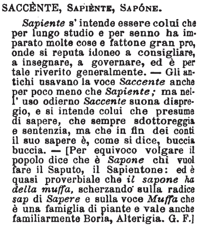 Saccente, Sapiente, Sapone - Sapiente s'intende essere colui che per lungo studio e per senno ha imparato molte cose e fattone gran pro, onde si reputa idoneo a consigliare, a insegnare, a governare, ed è per tale riverito generalmente. - Gli antichi usavano la voce Saccente anche per poco meno che Sapiente; ma nell'uso odierno Saccente suona dispregio, e si intende colui che presume di sapere, che sempre sdottoreggia e sentenzia, ma che in fin dei conti il suo sapere è, come si dice, buccia buccia. - [Per equivoco volgare il popolo dice che è Sapone chi vuol fare il Saputo, il Sapientone: ed è quasi proverbiale che il sapone ha della muffa, scherzando sulla radice sap di Sapere e sulla voce Muffa che è una famiglia di piante e vale anche familiarmente Boria, Alterigia. G. F.] [immagine]