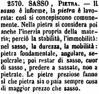 | Sasso, Pietra - Il sasso è informe, la pietra è lavorata: così si concepiscono comunemente. Nella pietra si considera poi anche l'inerzia propria della materia; perciò la stabilità, l'immobilità: nel sasso, la durezza, la mobilità: pietra fondamentale, angolare, sepolcrale; poi restar di sasso, cuor di sasso, prendere a sassate, non a pietrate. Le pietre preziose fanno sì che pietra sia o paia sempre cosa di maggior prezzo che sasso. [immagine] |