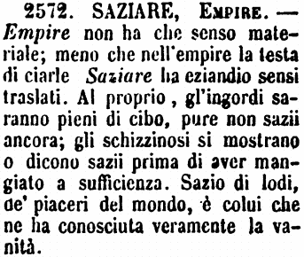 | Saziare, Empire - Empire non ha che senso materiale; meno che nell'empire la testa di ciarle Saziare ha eziandio sensi traslati. Al proprio, gl'ingordi saranno pieni di cibo, pure non sazii ancora; gli schizzinosi si mostrano o dicono sazii prima di aver mangiato a sufficienza. Sazio di lodi, de' piaceri del mondo, è colui che ne ha conosciuta veramente la vanità. [immagine] |
