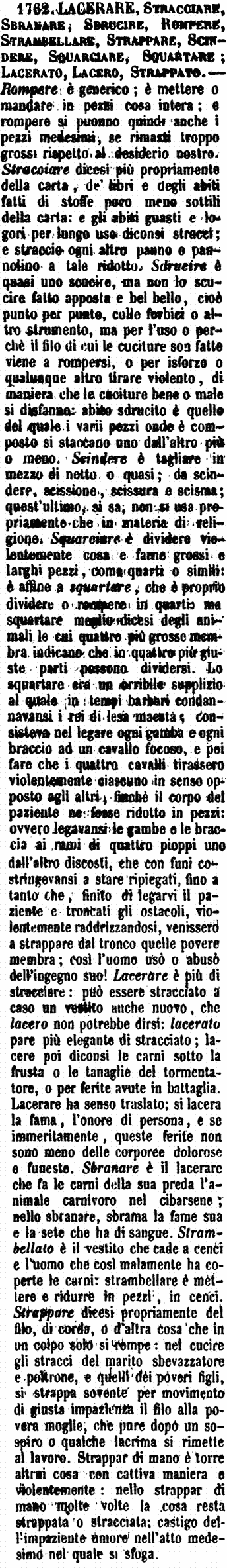 | Lacerare, Stracciare, Sbranare, Sdrucire, Rompere, Strambellare, Strappare, Scindere, Squarciare, Squartare; Lacerato, Lacero, Strappato - Rompere è generico; è mettere o mandare in pezzi cosa intera; e rompere si puonno quindi anche i pezzi medesimi, se rimasti troppo grossi rispetto al desiderio nostro. Stracciare dicesi più propriamente della carta, de' libri e degli abiti fatti di stoffe poco meno sottili della carta: e gli abiti guasti e logori per lungo uso diconsi stracci; e straccio ogni altro panno e pannolino a tale ridotto. Sdrucire è quasi uno scucire, ma non lo scucire fatto apposta e bel bello, cioè punto per punto, colle forbici o altro strumento, ma per l'uso o perchè il filo di cui le cuciture son fatte viene a rompersi, o per isforzo o qualunque altro tirare violento, di maniera che le cuciture bene o male si disfanno: abito sdrucito è quello del quale i varii pezzi onde è composto si staccano uno dall'altro più o meno. Scindere è tagliare in mezzo di netto o quasi; da scindere, scissione, scissura e scisma; quest'ultimo, si sa, non si usa propriamente che in materia di religione. Squarciare è dividere violentemente cosa e farne grossi e larghi pezzi, come quarti o simili: è affine a squartare, che è proprio dividere o rompere in quarti ma squartare meglio dicesi degli animali le cui quattro più grosse membra indicano che in quattro più giuste parti possono dividersi. Lo squartare era un orribile supplizio al quale in tempi barbari condannavansi i rei di lesa maestà; consisteva nel legare ogni gamba e ogni braccio ad un cavallo focoso, e poi fare che i quattro cavalli tirassero violentemente ciascuno in senso opposto agli altri, finchè il corpo del paziente ne fosse ridotto in pezzi: ovvero legavansi le gambe e le braccia ai rami di quattro pioppi uno dall'altro discosti, che con funi costringevansi a stare ripiegati, fino a tanto che, finito di legarvi il paziente e troncati gli ostacoli, violentemente raddrizzandosi, venissero a strappare dal tronco quelle povere membra; così l'uomo usò e abusò dell'ingegno suo! Lacerare è più di stracciare: può essere stracciato a caso un vestito anche nuovo, che lacero non potrebbe dirsi: lacerato pare più elegante di stracciato; lacere poi diconsi le carni sotto la frusta o le tanaglie del tormentatore, o per ferite avute in battaglia. Lacerare ha senso traslato; si lacera la fama, l'onore di persona, e se immeritamente, queste ferite non sono meno delle corporee dolorose e funeste. Sbranare è il lacerare che fa le carni della sua preda l'animale carnivoro nel cibarsene; nello sbranare, sbrama la fame sua e la sete che ha di sangue. Strambellato è il vestito che cade a cenci e l'uomo che così malamente ha coperte le carni: strambellare è mettere e ridurre in pezzi, in cenci. Strappare dicesi propriamente del filo, di corda, o d'altra cosa che in un colpo solo si rompe: nel cucire gli stracci del marito sbevazzatore e poltrone, e quelli dei poveri figli, si strappa sovente per movimento di giusta impazienza il filo alla povera moglie, che pure dopo un sospiro o qualche lacrima si rimette al lavoro. Strappar di mano è torre altrui cosa con cattiva maniera e violentemente: nello strappar di mano molte volte la cosa resta strappata o stracciata; castigo dell'impaziente umore nell'atto medesimo nel quale si sfoga. [immagine] |