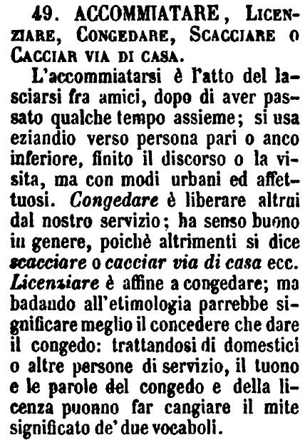 Accommiatare, Licenziare, Congedare, Scacciare o Cacciar via di casa - L'accomiatarsi è l'atto del lasciarsi fra amici, dopo di aver passato qualche tempo assieme; si usa eziandio verso persona pari o anco inferiore, finito il discorso o la visita, ma con modi urbani ed affettuosi. Congedare è liberare altrui dal nostro servizio; ha senso buono in genere, poichè altrimenti si dice scacciare o cacciar via di casa ecc. Licenziare è affine a congedare; ma badando all'etimologia parrebbe significare meglio il concedere che dare il congedo: trattandosi di domestici o altre persone di servizio, il tuono e le parole del congedo e della licenza puonno far cangiare il mite significato de' due vocaboli. [immagine]