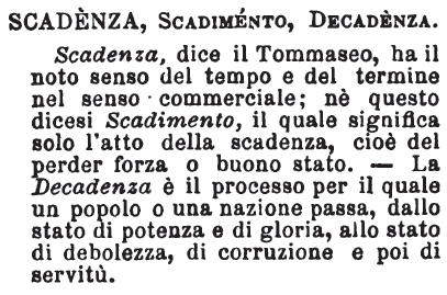 Scadenza, Scadimento, Decadenza - Scadenza, dice il Tommaseo, ha il noto senso del tempo e del termine nel senso commerciale; nè questo dicesi Scadimento, il quale significa solo l'atto della scadenza, cioè del perder forza o buono stato. - La Decadenza è il processo per il quale il popolo o una nazione passa, dallo stato di potenza e di gloria, allo stato di debolezza, di corruzione e poi di servitù. [immagine]