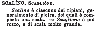 | Scalino, Scaglione - Scalino è ciascuno dei ripiani, generalmente di pietra, dei quali è composta una scala. - Scaglione è più rozzo, e di scala molto grande. [immagine] |