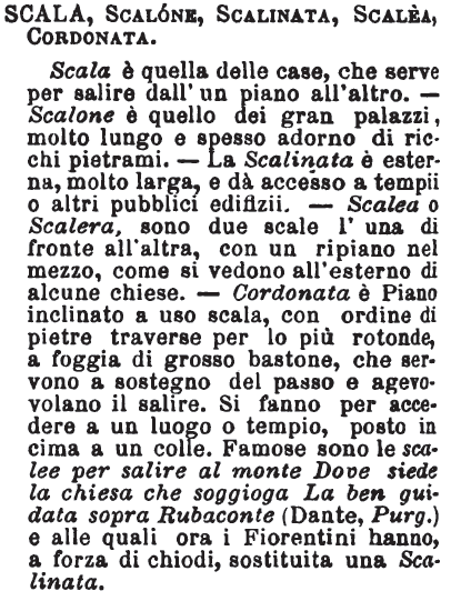 | Scala, Scalone, Scalinata, Scalea, Cordonata - Scala è quella delle case, che serve per salire dall'un piano all'altro. - Scalone è quello dei gran palazzi, molto lungo e spesso adorno di ricchi pietrami. - La Scalinata è esterna, molto larga, e dà accesso a tempii o altri pubblici edifizii. - Scalea o Scalera, sono due scale l'una di fronte all'altra, con un ripiano nel mezzo, come si vedono all'esterno di alcune chiese. - Cordonata è Piano inclinato a uso scala, con ordine di pietre traverse per lo più rotonde, a foggia di grosso bastone, che servono a sostegno del passo e agevolano il salire. Si fanno per accedere a un luogo o tempio, posto in cima a un colle. Famose sono le scalee per salire al monte Dove siede la chiesa che soggioga La ben guidata sopra Rubaconte (Dante, Purg.) e alle quali ora i Fiorentini hanno, a forza di chiodi, sostituita una Scalinata. [immagine] |