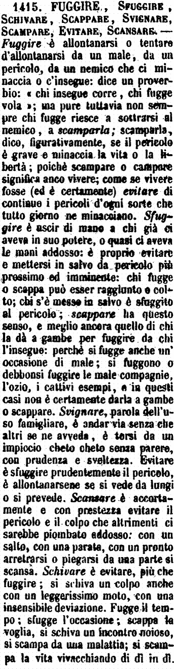 | Fuggire, Scappare - Fuggire è Allontanarsi con più o meno fretta da un luogo, da un'azione, per evitare il danno o la morte: «Fuggì da Firenze per paura della peste;» il perchè si usa anche invece di Evitare: «Fuggì la peste, uscendo da Firenze.» - Può fuggirsi anche senza viltà - Scappare è invece Allontanarsi, correndo, da un luogo, da un'azione, per timore non fondato e per viltà. [immagine] |