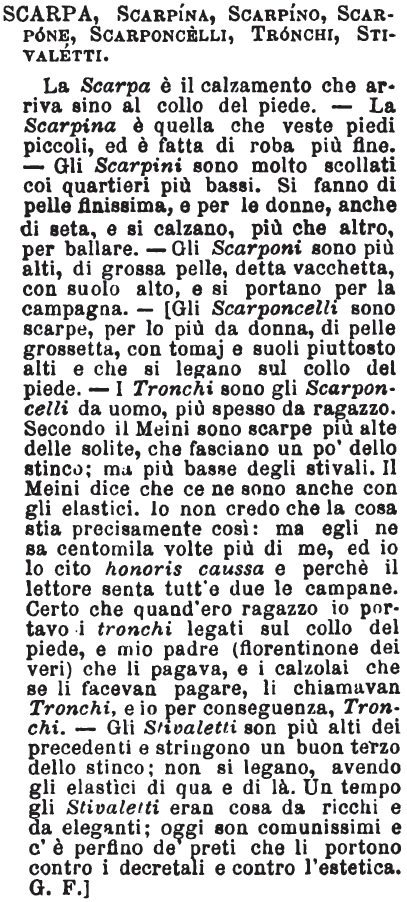 | Scarpa, Scarpina, Scarpino, Scarpone, Scarponcelli, Tronchi, Stivaletti - La Scarpa è il calzamento che arriva sino al collo del piede. - La Scarpina è quella che veste piedi piccoli, ed è fatta di roba più fine. - Gli Scarpini sono molto scollati coi quartieri più bassi. Si fanno di pelle finissima, e per le donne, anche di seta, e si calzano, più che altro, per ballare. - Gli Scarponi sono più alti, di grossa pelle, detta vacchetta, con suolo alto, e si portano per la campagna. - [Gli Scarponcelli sono scarpe, per lo più da donna, di pelle grossetta, con tomaj e suoli piuttosto alti e che si legano sul collo del piede. - I Tronchi sono gli Scarponcelli da uomo, più spesso da ragazzo. Secondo il Meini sono scarpe più alte delle solite, che fasciano un po' dello stinco; ma più basse degli stivali. Il Meini dice che ce ne sono anche con gli elastici. Io non credo che la cosa stia precisamente così: ma egli ne sa centomila volte più di me, ed io lo cito honoris caussa e perchè il lettore senta tutt'e due le campane. Certo che quand'ero ragazzo io portavo i tronchi legati sul collo del piede, e mio padre (fiorentinone dei veri) che li pagava, e i calzolai che se li facevan pagare, li chiamavan Tronchi, e io per conseguenza, Tronchi. - Gli Stivaletti son più alti dei precedenti e stringono un buon terzo dello stinco; non si legano, avendo gli elastici di qua e di là. Un tempo gli Stivaletti eran cosa da ricchi e da eleganti; oggi son comunissimi e c'è perfino de' preti che li portono contro i decretali e contro l'estetica. G.F.] [immagine] |