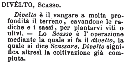 Divelto, Scasso - Divelto è il vangare a molta profondità il terreno, cavandone le radiche e i sassi, per piantarvi viti o ulivi. - Lo Scasso è l'operazione mediante la quale si fa il divelto, la quale si dice Scassare. Divelto significa altresì la coltivazione già compiuta. [immagine]