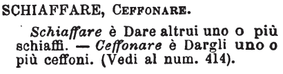| Schiaffare, Ceffonare - Schiaffare è Dare altrui uno o più schiaffi. - Ceffonare è Dargli uno o più ceffoni. (Vedi al num. 414). [immagine] |