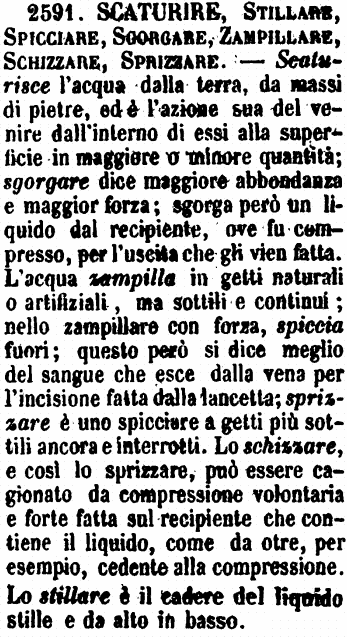 Scaturire, Stillare, Spicciare, Sgorgare, Zampillare, Schizzare, Sprizzare - Scaturisce l'acqua dalla terra, da massi di pietre, ed è l'azione sua del venire dall'interno di essi alla superficie in maggiore o minore quantità; sgorgare dice maggiore abbondanza e maggior forza; sgorga però un liquido dal recipiente, ove fu compresso, per l'uscita che gli vien fatta. L'acqua zampilla in getti naturali o artifiziali, ma sottili e continui; nello zampillare con forza, spiccia fuori; questo però si dice meglio del sangue che esce dalla vena per l'incisione fatta dalla lancetta; sprizzare è uno spicciare a getti più sottili ancora e interrotti. Lo schizzare, e così lo sprizzare, può essere cagionato da compressione volontaria e forte fatta sul recipiente che contiene il liquido, come da otre, per esempio, cedente alla compressione. Lo stillare è il cadere del liquido stille e da alto in basso. [immagine]