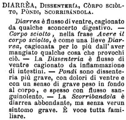 | Diarrea, Dissenteria, Corpo sciolto, Pondi, Scorribandola - Diarrea è flusso di ventre, cagionato da qualche sconcerto digestivo. - Corpo sciolto, nella frase Avere il corpo sciolto, è come una lieve Diarrea, cagionata per lo più dall'aver mangiato qualche cosa che provochi ciò. - La Dissenteria è flusso di ventre cagionato da infiammazione di intestini. - Pondi sono dissenteria più grave, con dolori di ventre e con un senso di grave peso in fondo al corpo, e spesso con flusso sanguinolento. - La Scorribandola è diarrea abbondante, ma senza verum sintomo grave. E' voce tutta familiare. [immagine] |