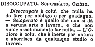Disoccupato, Scioperato, Ozioso - Disoccupato è colui che nulla ha da fare per obbligo o per guadagno. - Scioperato è quello che non si dà a veruna arte o lavoro, e che non vuole assolutamente far nulla. - L'Ozioso è colui che è inerte per natura e aborrisce da qualunque studio o lavoro. [immagine]