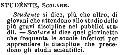 Studente, Scolare - Studente si dice, più che altro, di giovani che attendono allo studio delle più gravi discipline nei pubblici studii. - Scolare si dice quel giovinetto che frequenta le scuole inferiori per apprendere le discipline che precedono gli studii scientifici. [immagine]