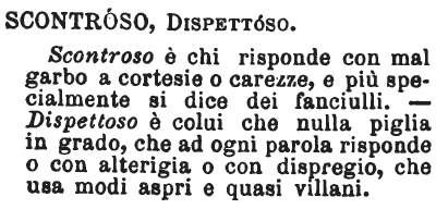 Scontroso, Dispettoso - Scontroso è chi risponde con mal garbo a cortesie o carezze, e più specialmente si dice dei fanciulli. - Dispettoso è colui che nulla piglia in grado, che ad ogni parola risponde o con alterigia o con dispregio, che usa modi aspri e quasi villani. [immagine]