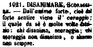 Disanimare, Scoraggiare - Dall'anima forte, cioè dal forte sentire viene il coraggio; il quale da sè è molte volte fattizio: chi disanima, scoraggia; chi scoraggia non disamina, o almeno non sempre. [immagine]