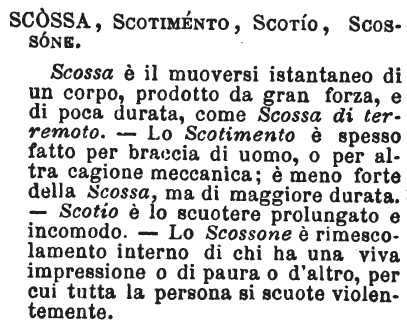 | Scossa, Scotimento, Scotio, Scossone - Scossa è il muoversi istantaneo di un corpo, prodotto da gran forza, e di poca durata, come Scossa di terremoto. - Lo Scotimento è spesso fatto per braccia di uomo, o per altra cagione meccanica; è meno forte della Scossa, ma di maggiore durata. - Scotio è lo scuotere prolungato e incomodo. - Lo Scossone è rimescolamento interno di chi ha una viva impressione o di paura o d'altro, per cui tutta la persona si scuote violentemente. [immagine] |
