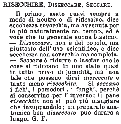 Risecchire, Disseccare, Seccare - Il primo, usato quasi sempre a modo di neutro o di riflessivo, dice secchezza soverchia, ma avvenuta per lo più naturalmente col tempo, ed è voce che in generale suona biasimo. - Disseccare, non è del popolo, ma piuttosto dell'uso scientifico, e dice secchezza non soverchia ma completa. - Seccare è ridurre o lasciar che le cose si riducano in uno stato quasi in tutto privo di umidità, ma non tale che possano dirsi disseccate e tantomeno risecchite. - Si seccano i fichi, i pomodori, i funghi, perchè si conservino per l'inverno; il pane risecchito non si può più mangiare che inzuppandolo; un preparato anatomico ben disseccato può durare a lungo. G. F. [immagine]
