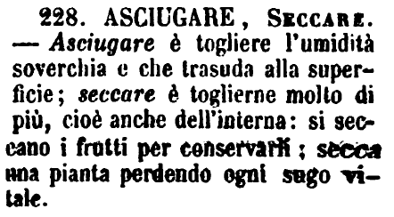 Asciugare, Seccare - Asciugare è togliere l'umidità soverchia e che trasuda alla superficie; seccare è toglierne molto di più, cioè anche dell'interna: si seccano i frutti per conservarli; secca una pianta perdendo ogni sugo vitale. [immagine]