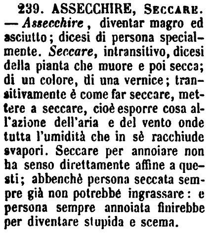 Assecchire, Seccare - Assecchire, diventar magro ed asciutto; dicesi di persona specialmente. Seccare, intransitivo, dicesi della pianta che muore e poi secca; di un colore, di una vernice; transitivamente è come far seccare, mettere a seccare, cioè esporre cosa all'azione dell'aria e del vento onde tutta l'umidità che in sè racchiude svapori. Seccare per annoiare non ha senso direttamente affine a questi; abbenchè persona seccata sempre già non potrebbe ingrassare: e persona sempre annoiata finirebbe per diventare stupida e scema. [immagine]