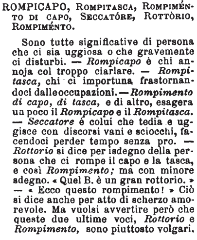 | Rompicapo, Rompitasca, Rompimento di capo, Seccatore, Rottorio, Rompimento - Sono tutte significative di persona che ci sia uggiosa o che gravemente ci disturbi. - Rompicapo è chi annoja col troppo ciarlare. - Rompitasca, chi ci importuna frastornandoci dalle occupazioni. - Rompimento di capo, di tasca, e di altro, esagera un poco il Rompicapo e il Rompitasca. - Seccatore è colui che tedia e uggisce con discorsi vani e sciocchi, facendoci perder tempo senza pro. - Rottorio si dice per isdegno della persona che ci rompe il capo e la tasca, e così Rompimento; ma con minore sdegno. «Quel B. è un gran rottorio.» - «Ecco questo rompimento!» Ciò si dice anche per atto di scherzo amorevole. Ma vuolsi avvertire però che queste due ultime voci, Rottorio e Rompimento, sono piuttosto volgari. [immagine] |
