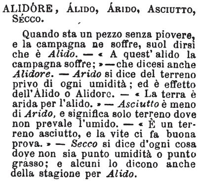 Alidore, Alido, Arido, Asciutto, Secco - Quando sta un pezzo senza piovere, e la campagna ne soffre, suol dirsi che è Alido. - « A quest'alido la campagna soffre;» - che dicesi anche Alidore. - Arido si dice del terreno privo di ogni umidità; ed è effetto dell'Alido o Alidore. - « La terra è arida per l'alido.» - Asciutto è meno di Arido, e significa solo terreno dove non prevale l'umido. - « E' un terreno asciutto, e la vite ci fa buona prova.» - Secco si dice d'ogni cosa dove non sia punto umidità o punto grasso; e alcuni lo dicono anche della stagione per Alido. [immagine]