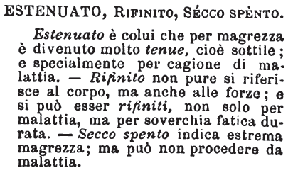 Estenuato, Rifinito, Secco spento - Estenuato è colui che per magrezza è divenuto molto tenue, cioè sottile; e specialmente per cagione di malattia. - Rifinito non pure si riferisce al corpo, ma anche alle forze; e si può esser rifiniti, non solo per malattia, ma per soverchia fatica durata. - Secco spento indica estrema magrezza; ma può non procedere da malattia. [immagine]