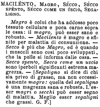Macilento, Magro, Secco, Secco spento, Secco come un uscio, Segaligno - Magro è colui che ha addosso poco tessuto cellulare e poca carne sopra le ossa: il magro, può esser sano e robusto. - Macilento è magro e sfinito per malattia di consunzione. - Secco è più che Magro, ed è quando i muscoli sono così poco sviluppati, che la pelle si informa dalle ossa. - Secco spento, Secco come un uscio sono iperboli significanti estreme magrezza. - [Segaligno si dice di chi sia privo di grasso, ma non eccessivamente magro: quella del segaligno è una magrezza sana e robusta. L'esser magri o secchi può esser segno di malattia. Meglio esser segaligni che grassi. G. F.] [immagine]