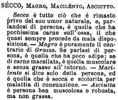 Secco, Magro, Macilento, Asciutto - Secco è tutto ciò che è rimasto privo del suo umor naturale, e, parlandosi di persona, è quella che ha pochissima carne sull'ossa, il che quasi sempre procede da mala disposizione. - Magro è puramente il contrario di Grasso. Se parlasi di persona, è quella che ha poco adipe; se di carne macellata, è quella muscolare e senza grasso all'intorno. - Macilento si dice solo della persona, ed è quella che è secca e scolorita per malattia di consunzione. - Asciutta è persona ben muscolosa e robusta, ma non grassa. [immagine]