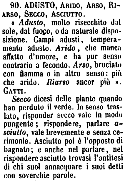 Adusto, Arido, Arso, Riarso, Secco, Asciutto - « Adusto, molto risecchito dal sole, dal fuoco, o da naturale disposizione. Campi adusti, temperamento adusto. Arido, che manca affatto d'umore, e ha pur senso contrario a fecondo. Arso, bruciato con fiamma o in altro senso: più che arido. Riarso ancor più ». Gatti.