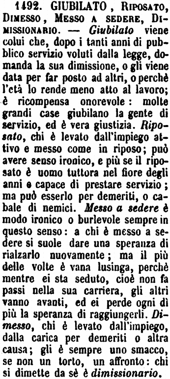 Giubilato, Riposato, Dimesso, Messo a sedere, Dimissionario - Giubilato viene colui che, dopo i tanti anni di pubblico servizio voluti dalla legge, domanda la sua dimissione, o gli viene data per far posto ad altri, o perchè l'età lo rende meno atto al lavoro; è ricompensa onorevole: molte grandi case giubilano la gente di servizio, ed è vera giustizia. Riposato, chi è levato dall'impiego attivo e messo come in riposo; può avere senso ironico, e più se il riposato è uomo tuttora nel fiore degli anni e capace di prestare servizio; ma può esserlo per demeriti, o cabale di nemici. Messo a sedere è modo ironico o burlevole sempre in questo senso: a chi è messo a sedere si suole dare una speranza di rialzarlo nuovamente; ma il più delle volte è vana lusinga, perchè mentre ei sta seduto, cioè non fa passi nella sua carriera, gli altri vanno avanti, ed ei perde ogni dì più la speranza di raggiungerli. Dimesso, chi è levato dall'impiego, dalla carica per demeriti o altra causa; gli è sempre uno smacco, se non un torto, un affronto: chi si dimette da sè è dimissionario. [immagine]