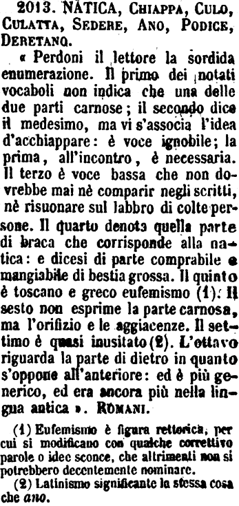 Natica, Chiappa, Culo, Culatta, Sedere, Ano, Podice, Deretano - « Perdoni il lettore la sordida enumerazione. Il primo dei notati vocaboli non indica che una delle due parti carnose; il secondo dice il medesimo, ma vi s'associa l'idea d'acchiappare: è voce ignobile; la prima, all'incontro, è necessaria. Il terzo è voce bassa che non dovrebbe mai nè comparir negli scritti, nè risuonare sul labbro di colte persone. Il quarto denota quella parte di braca che corrisponde alla natica: e dicesi di parte comprabile e mangiabile di bestia grossa. Il quinto è toscano e greco eufemismo (1). Il sesto non esprime la parte carnosa, ma l'orifizio e le aggiacenze. Il settimo è quasi inusitato (2). L'ottavo riguarda la parte di dietro in quanto s'oppone all'anteriore: ed è più generico, ed era ancora più nella lingua antica ». Romani.