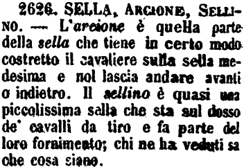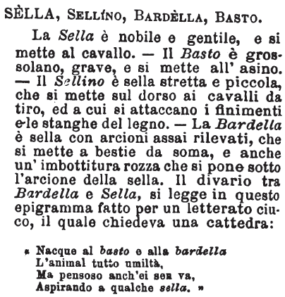 | Sella, Sellino, Bardella, Basto - La Sella è nobile e gentile, e si mette al cavallo. - Il Basto è grossolano, grave, e si mette all'asino. - Il Sellino è sella stretta e piccola, che si mette sul dorso ai cavalli da tiro, ed a cui si attaccano i finimenti e le stanghe del legno. - La Bardella è sella con arcioni assai rilevati, che si mette a bestie da soma, e anche un'imbottitura rozza che si pone sotto l'arcione della sella. Il divario tra Bardella e Sella, si legge in questo epigramma fatto per un letterato ciuco, il quale chiedeva una cattedra: